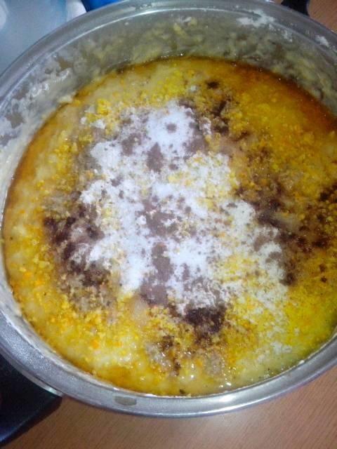 1) 100 г муки (160 мл) развести в 1 стакане холодного молока. Добавить эту смесь в 1 стакан кипящего молока. Размешать деревянной ложкой. Это делать в отдельной миске.