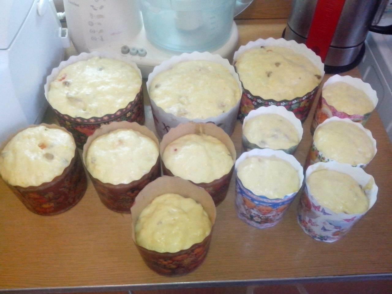 10) Теперь раскладываем в формы для выпекания. Наливаем по половине формы. (реально по половине, иначе после поднятия вытечет) Выпекать при температуре около 150-180 градусов. Пасха на 1 кг - примерно 45 минут. До 1 кг - 25-30 минут. В моей духовке печется дольше. Ставить пониже и выключить режим сверху, а то верх сгорает, а внутри сырая.