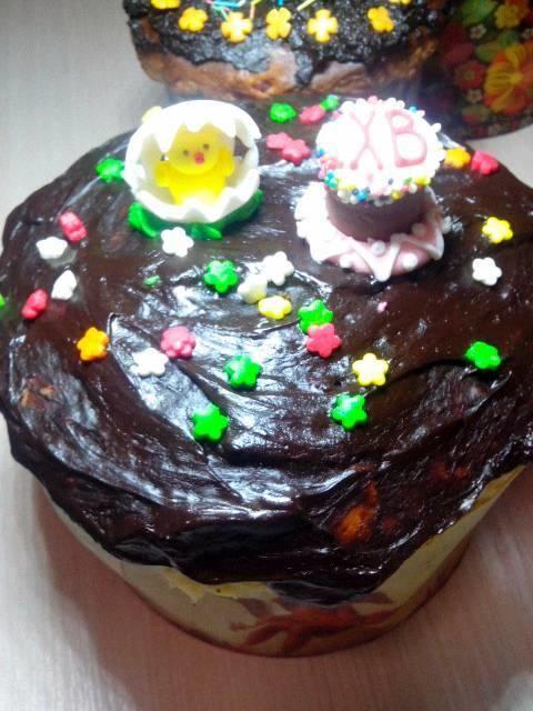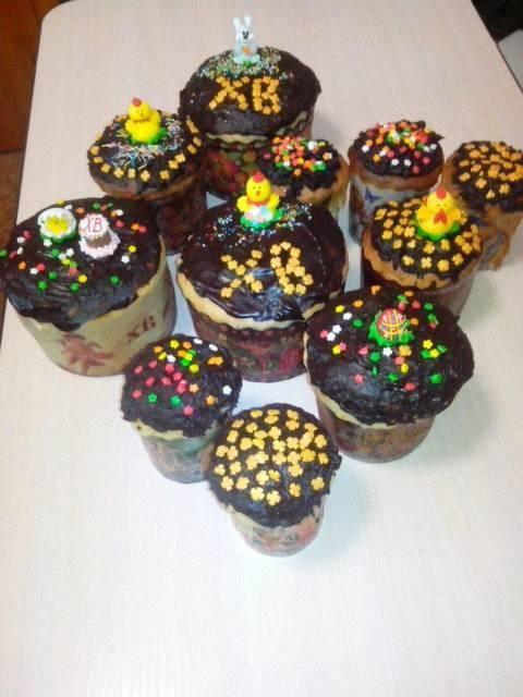 Манька уже который год помогала мне, моя умничка. Это процесс не из легких и требует много времени. В этом году мы решили украсить пасхи шоколадом. Но оказалось, что шоколадная глазурь - очень коварная штука. В результате, уже последние пасхи получились не такими красивыми как первые. Пасок мы печем много, чтобы угощать всех наших родных и близких. Первая пасочка уже даже успела отправиться в гости к моим кумовьям )