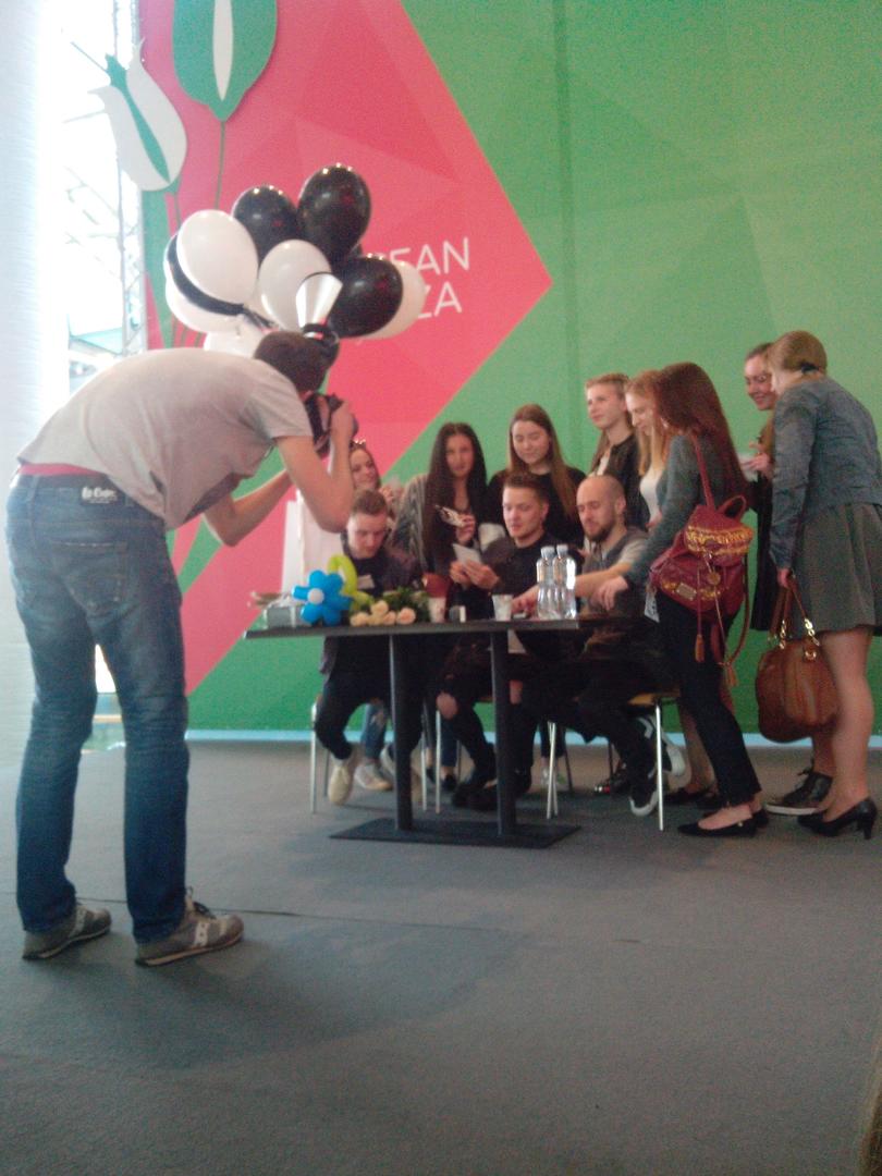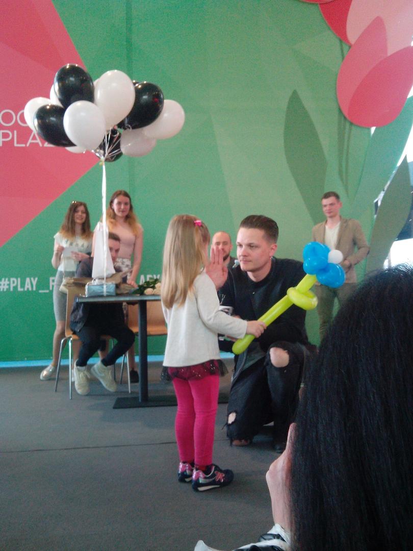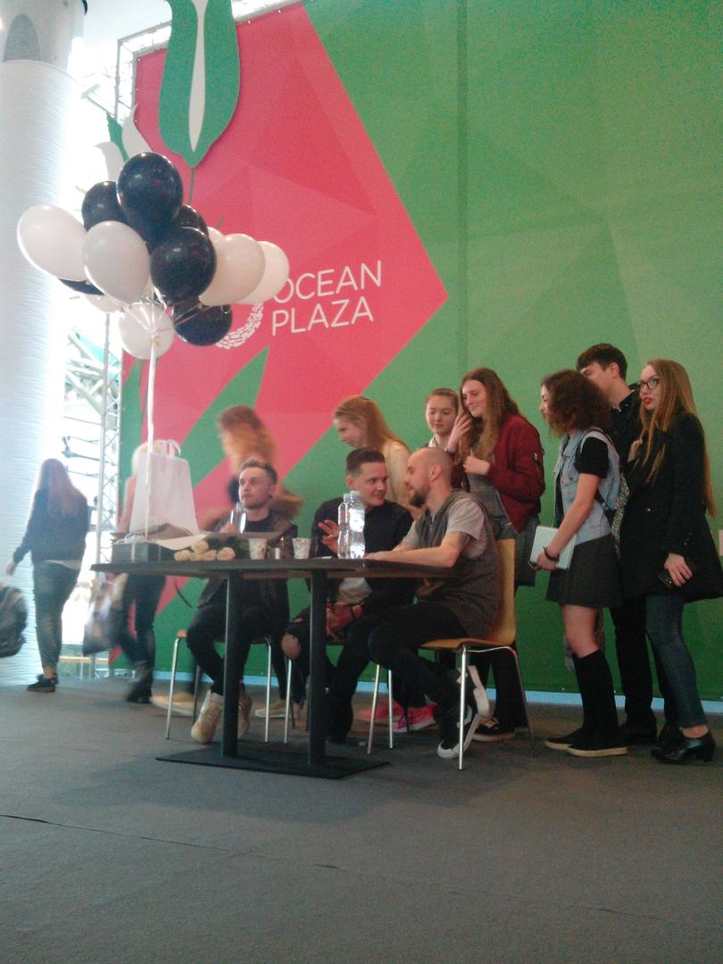 Очень понравился Женя и его поведение. Он был очень открытым, приветливым. Внимательно выслушивал вопросы, всегда смотрел прямо на собеседника, отвечая. Без пафоса и понтов. А когда на сцену во время автограф-сессии вышла девочка лет трех - сам выбежал из-за стола, подошел, подарил ей шарик и сфоткался с ней отдельно. Во время раздачи карточек с автографами всем говорил спасибо, вручал лично каждому в руки. В фоне играли их песни и Женя периодически выдавал роковые эмоции. Так интересно было за ним наблюдать. Клевый и позитивный парень. А еще у него сегодня день рождения )